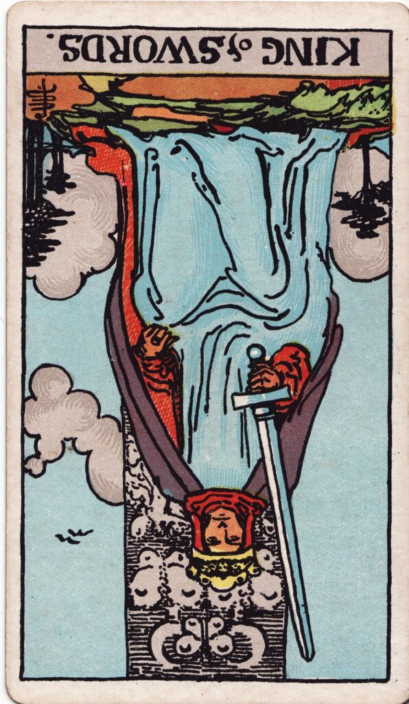 ソードのキング【逆位置】大凶!権力の濫用と冷酷な独裁、知性の悪用を示唆